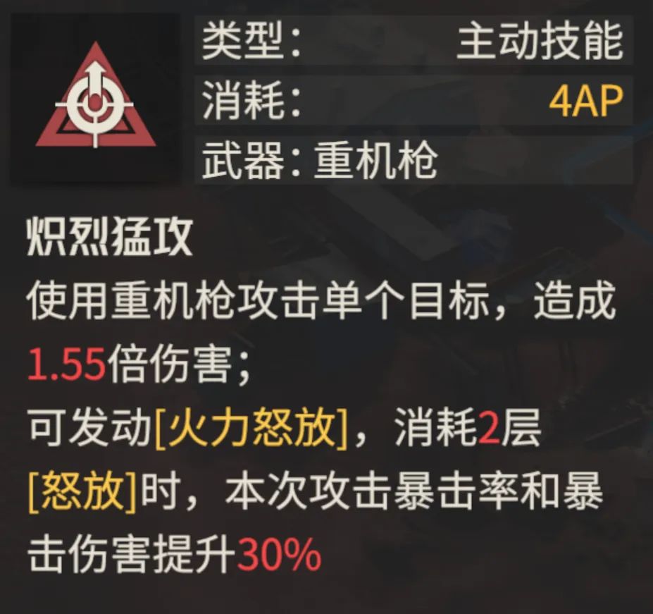 然后是玛蒂尔达最核心的单体输出技能【炽烈猛攻】,此技能基础状态下是4AP换1.55倍的伤害,外加11颗子弹看来还行对吧,而消耗2层“怒放”则是6AP换1.55倍的伤害,外加20颗子弹与30%暴击/爆伤的预期提升,大家也可以看一看下方的简易伤害对比图,动不动这2层“怒放”的消耗其实对于这个技能而言,伤害提升的幅度远超2倍之多,夸张点说都要接近于3倍了,所以目前大家看到的颇为夸张的输出其实都是这个技能+2层“怒放”消耗下打出来的,当然这里还会额外加上一些前提。