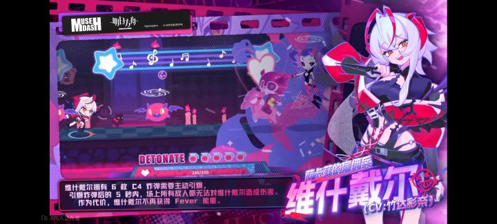 主动:保留原有fever效果;维什戴尔每次进入fever后立即获得六枚弹药(最多6枚)和两个魂灵之影(最多3个)。弹药需要手动释放且拥有5秒冷却时间。手动释放弹药后的5秒内所有Miss判定转化为Great,Great判定将转化为Perfect,且得分提升至220%。