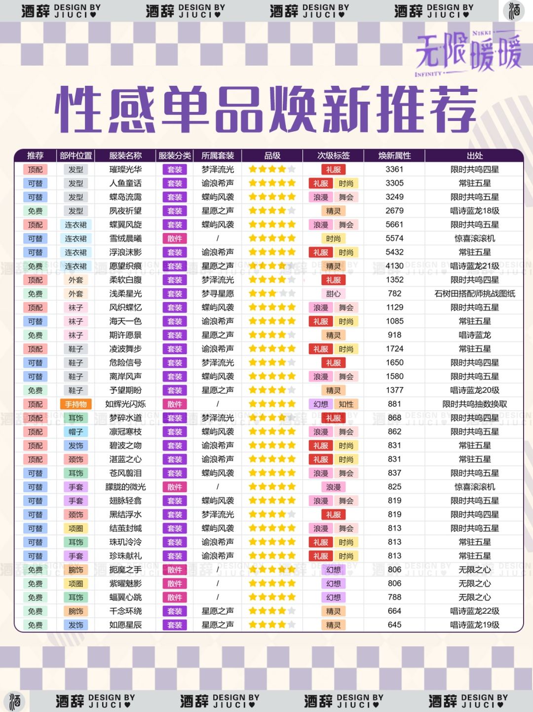 分值:重新做了排版,方便大家替换 顶配>其他,免费和可替都可以根据自身拥有的数量去替换