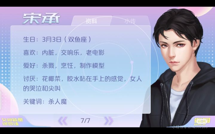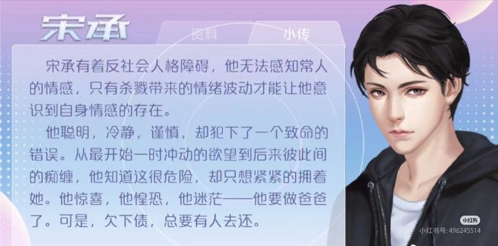 安利一下女寝这个游戏里宋承的线,喜欢反差感并且接受能力高的的一定要尝试一下这个剧情,宋承有番外的哦,就在作者大大的番外作品里。别看他第一眼看上去好像没有其他攻略对象好看,但细看也还不错哎。女寝的攻略对象总共有七个(如果算上安俊宁的话,也就是安俊毅他姐),错过一个还是挺可惜的吧?