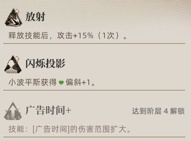 至于异能的通用特性模板,这实在没什么好说的。回能和数值确实是很有用的属性,但是这样简单粗暴的实现方式,总让人没法留下深刻的印象。更不用说有一些功能性的异能者,自身攻击力很低,大多数时候也不需要他们去打伤害,如果无法造成击杀就无法回能,而加攻击力也只能是聊胜于无,比如波平斯小姐,这个通用特性放在她身上实在是有些幽默了。但凡有个偏生存向的模板,也不至于导致机制这么割裂。