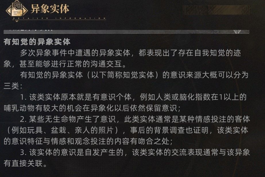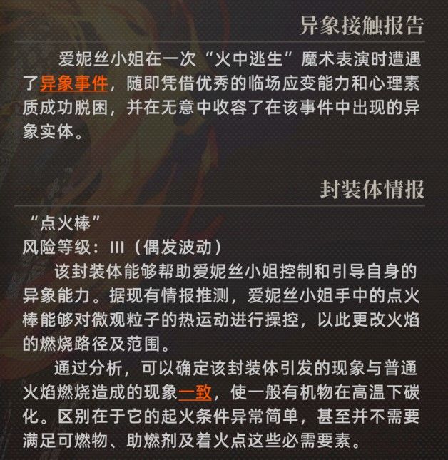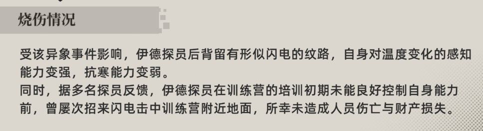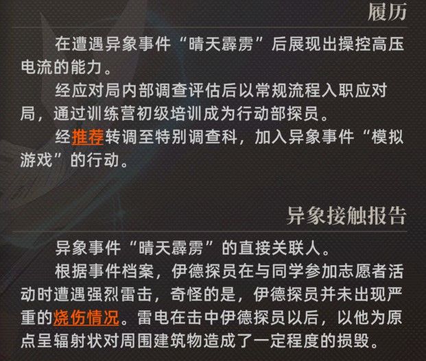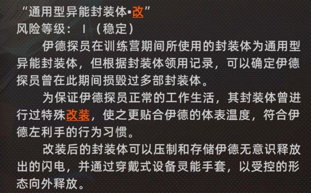 由于官方在演示中和介绍中都使用了伊德来作为案例,我们便从伊德的档案开始分析。通过伊德的档案可以明显地看出,伊德通过异象事件获得了特殊能力,而封装体的作用是帮助他更好地利用这个能力。这符合我们上面对于异能者定义的分析。从具体情况来看,异能者似乎更接近于异象实体的定义而非普通人类: