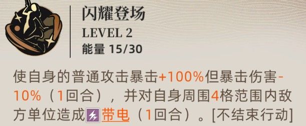 电光游侠由于被动简单粗暴的加攻击数值,配合1技能对带电敌人连击增加,以及带电状态自带的暴击率加成,一套组合拳使电光游侠拥有了极高的单次伤害。在全员51级的练度时面对奇点列车3的列车长,所有角色中几乎只有电光游侠一人可以造成可观的伤害。加上击杀带电单位获得再动和带电状态自带的弹射,在清杂关卡有着较为舒服的体验,面对法抗没有那么高的boss时,也完全可以胜任主力输出的职责。