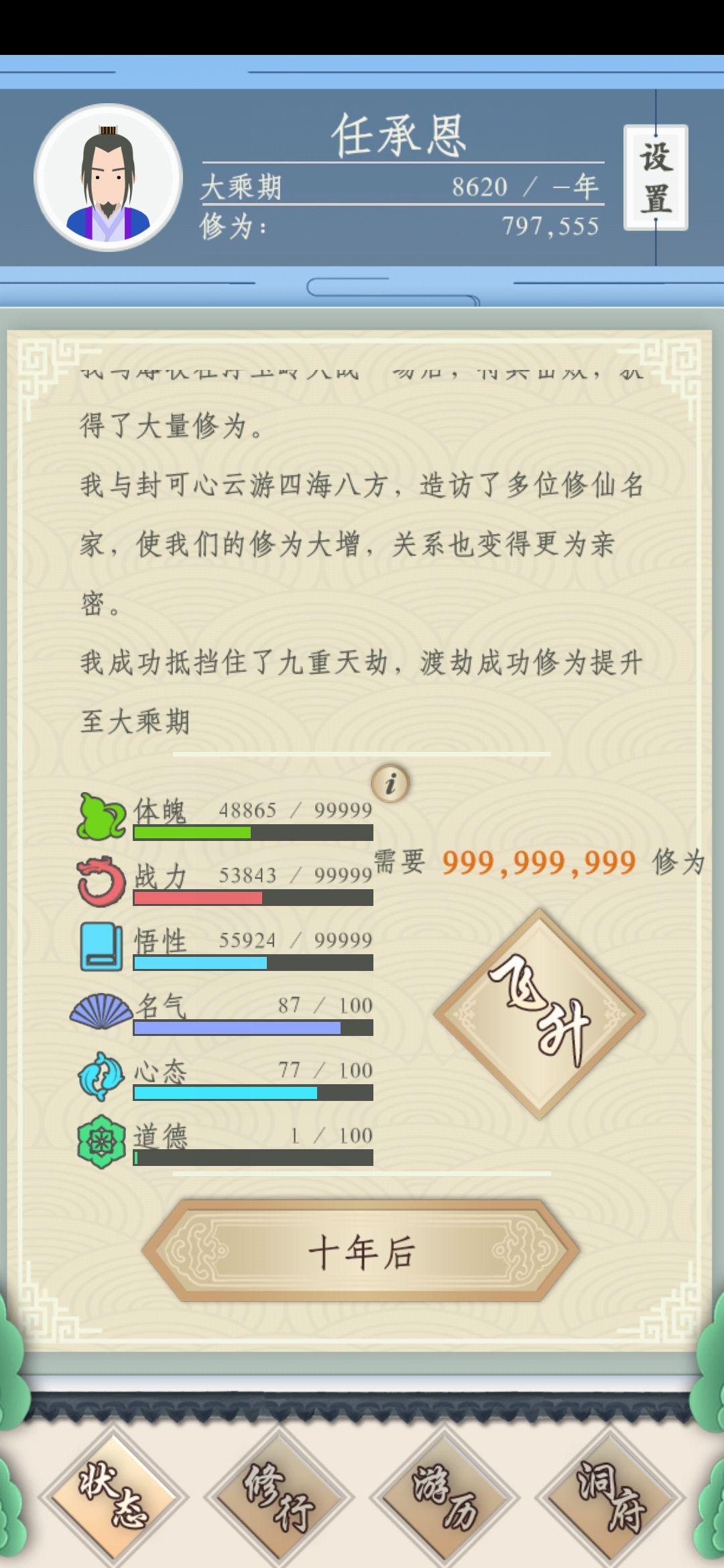 反正功法,丹药那个贵用哪个,用青吼兽刷地仙大会和天仙大会(心态一定要在60以上,不然修为增长会降低,亲测!!!),前期道德最好一直满的,有部分奇遇在渡劫前收益不错,渡劫后道德随意(我最后1000年经常被讨伐