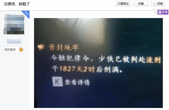 据该网友透露,自己在游戏中因触犯律令而被判处了长达五年的流刑,且这五年是现实世界的真实时间,还需玩家保持在线状态才能计时,这一特殊的“惩罚”方式让该网友甚至萌生了卸载游戏的念头。从其晒出的图片可以看到,曾经功高盖世的大侠如今只能在狱中度过漫长时光,甚至要含泪“踩缝纫机”。