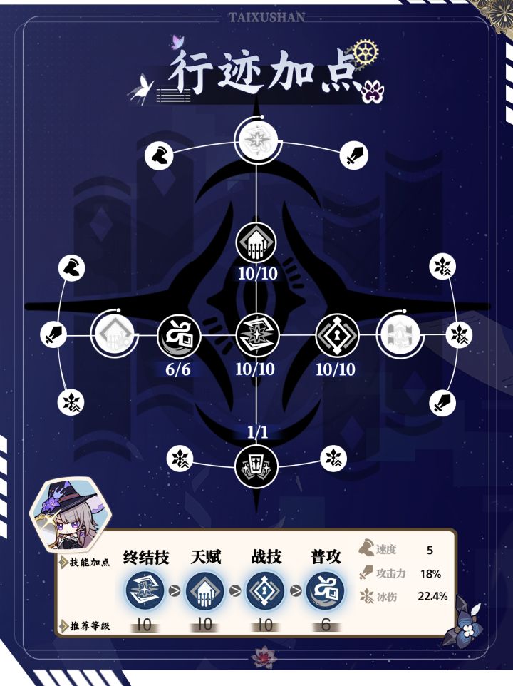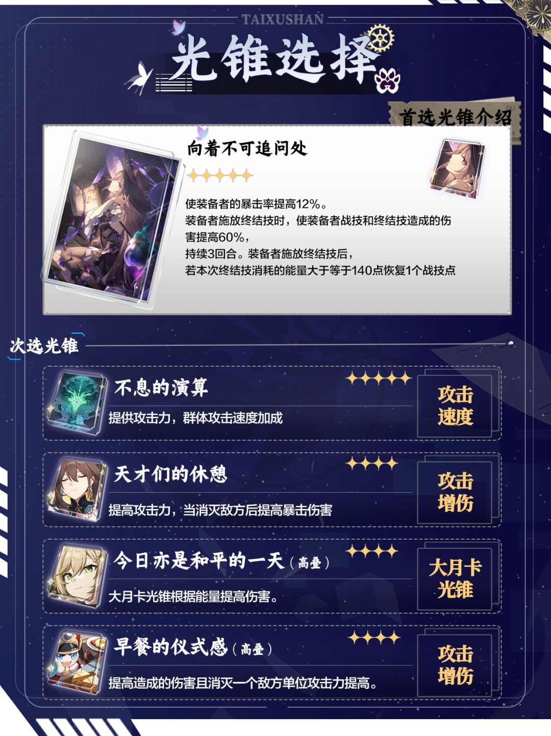 ☆☆☆☆☆向着不可追问处:提高暴击率和战技,终结技伤害。施放大招恢复战技点。