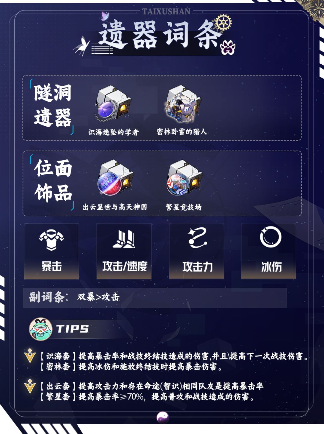 智识命途角色≥2时,提高我方全体暴击伤害。多频,智识角色施加的【解读】层数增加。