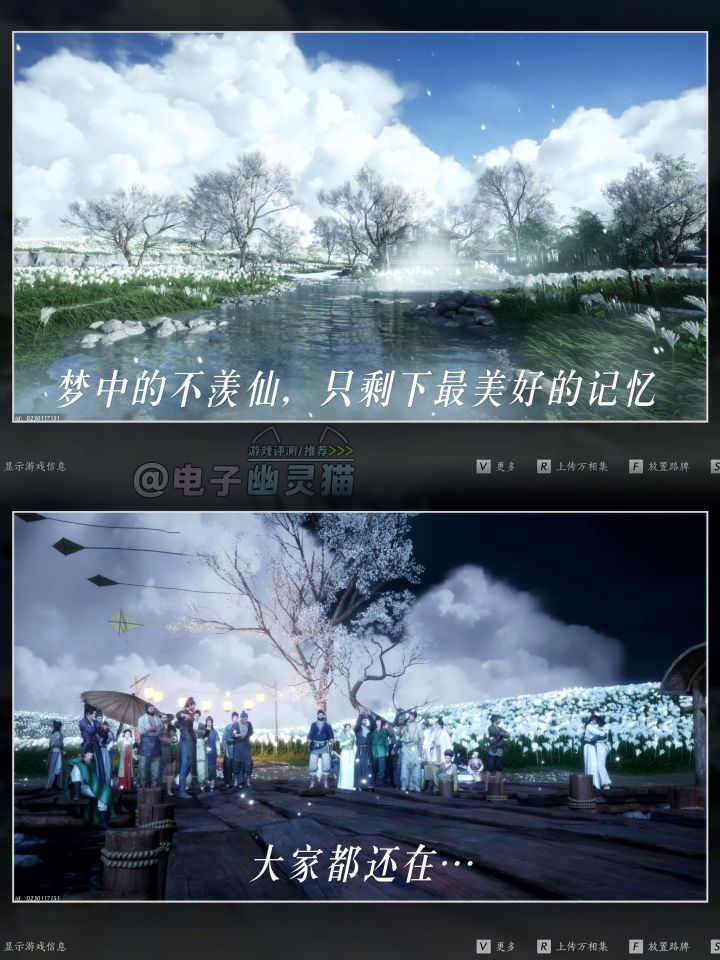 最后前往了梦中的不羡仙,整个场景都是非常明亮的,自带柔光,大家叫我少东家,还和刀哥切磋了一场。而在梦中不羡仙我拍的最后一张照片,就是大家都站在河边的一幕,并且我顺手放了个路牌,这是唯一一次,可能也是最后一次给大家拍合照的机会了吧(右边还有一对小情侣卿卿我我呢)。