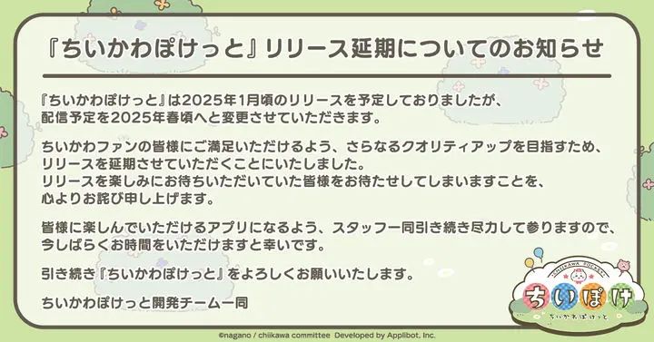 ✨️原定在2025年1月海外上线的手游《Chiikawa Pocket》,宣布延期到2025年春季开服,原因是进一步提升游戏品质。