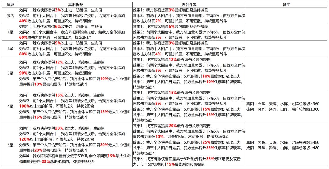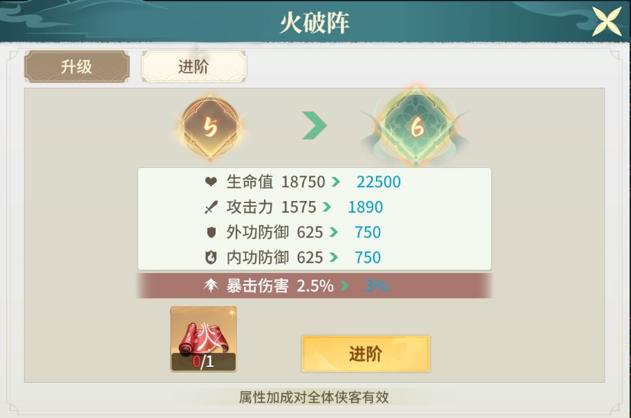如上图示,阵法5星后,可以使用多出来的阵法来【进阶】,进阶可以提升【生命值、攻击力和内外防】和特殊属性