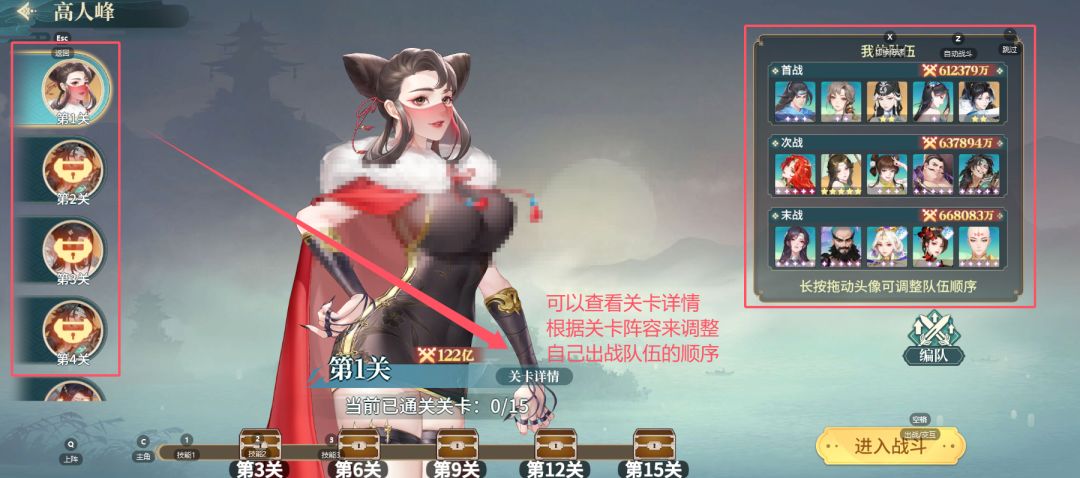 根据这三天的游戏体验,关卡的阵容应该是随机抓取玩家的阵容(第三天高级难度第一关我就过不去,详见上图,我65亿,第一关就122亿),可以先在左侧查看关卡阵容,然后灵活调整自己的阵容和【出战顺序】