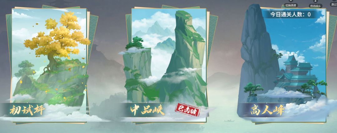 【奇宫角逐】在【不觉上云楼】模块(历练→不觉上云楼→奇宫角逐),每天有【初试坪】和【中品侠】两个难度可选择(初级和中级,但是新区一开始只能初级,需要等玩家达到13亿战力才能开启),每个等级都有15关,每通过3关可以获得一次奖励,通关【中品侠】后可解锁【高人峰】,即高级难度。