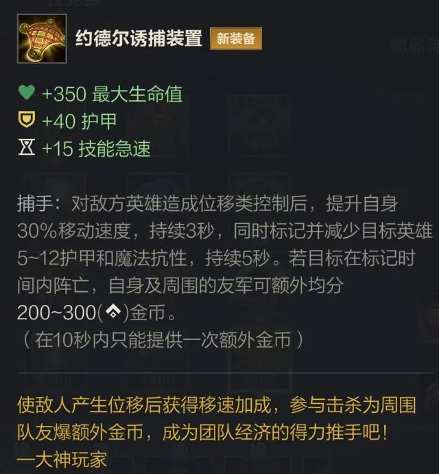 装备:约德尔诱捕装置不止能够减少目标的护甲与魔法抗性,在标记后一定时间内击杀敌方英雄还会瓜分金币奖励!哪个射手不爱呢?