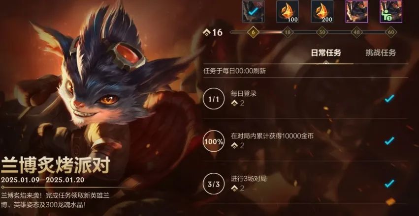 兰博炙焰来袭!截止至1月20日,召唤师完成任务即可获得新英雄机械公敌 兰博、姿态-出发、龙魂水晶*300好礼。