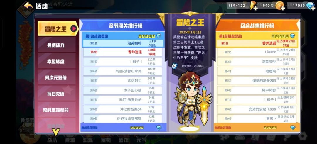 (2)小氪档:如果要冲击冒险王前3的话(没有大佬的日子开号,可以冲双第一),在104元的限时礼包基础上,继续氪金限时礼包的128+328元两个档位,同时保持后面6天的每天充值6元的每日礼包,可获得每天充值的奖励。共计氪金104+128+328+36+88(半年契约,如永久契约上线后可替换成永久)=684元。那我本人就是按这个金额氪的,这个档位大家看我的榜基本可以明白,是可以冲击双榜第一的,但是确实讲究对游戏的理解,你得先学会怎么玩,不然这个档位冲榜还是有难度。这个氪度第一天我强度不够,仅能推到92关。