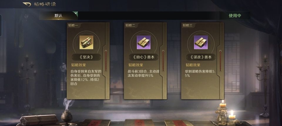 黄盖战法:苦肉计+坚如磐石+趁火打劫。韬略库:坚决(专属)+励心善本+谋战善本。由于角色受到当前等级的局限,故而尚未匹配高级兵种。