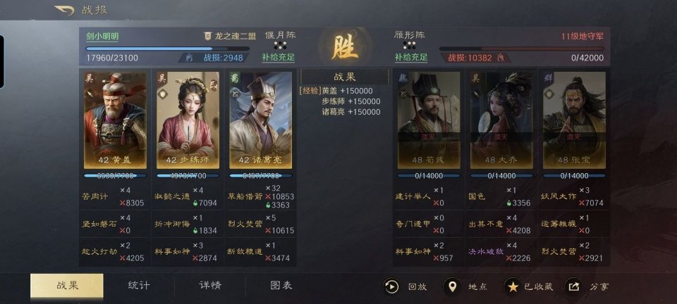 步练师战法:淑懿之德+折冲御侮+料事如神。韬略库:慈慧(专属)+避勇善本+谋战善本。由于角色受到当前等级的局限,故而尚未匹配高级兵种。这套偃月阵型,黄盖和诸葛亮在前排,两人配合打火攻、混乱和断粮,让敌方在遭受重大损失的同时也很难发起像样的反击。位于偃月阵后排的步练师,则如定海神针一般给全队贡献着谋略伤害量加成和治疗补给,而且还能对敌方施加技穷效果。