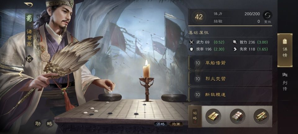 诸葛亮战法:草船借箭+烈火焚营+断敌粮道。韬略库:气临善本+威智善本+出师表(专属)。由于角色受到当前等级的局限,故而尚未匹配高级兵种。