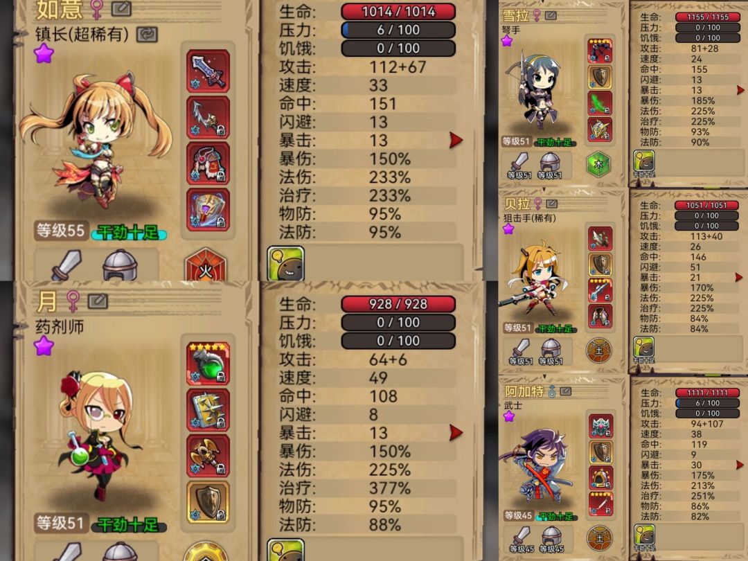 个人选择:2个金火火暴伤,2个水火火暴伤,1个火火土暴伤,6个金生命,5个水生命,4个火暴伤,5个土治疗。