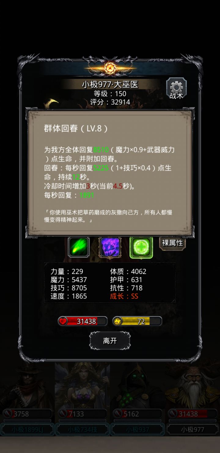 所以具体的操作是:巫医开局始终奶,然后切手动等boss魔群攻先出手(不要太快,给他先跳dot也不影响),不要看圣裁快死了就忍不住出手,全员3万8➕的血量,顶得到祭祀出手的,这套巫医10500的回复,够用(都混到42了,应该都不缺11+技的战利)
