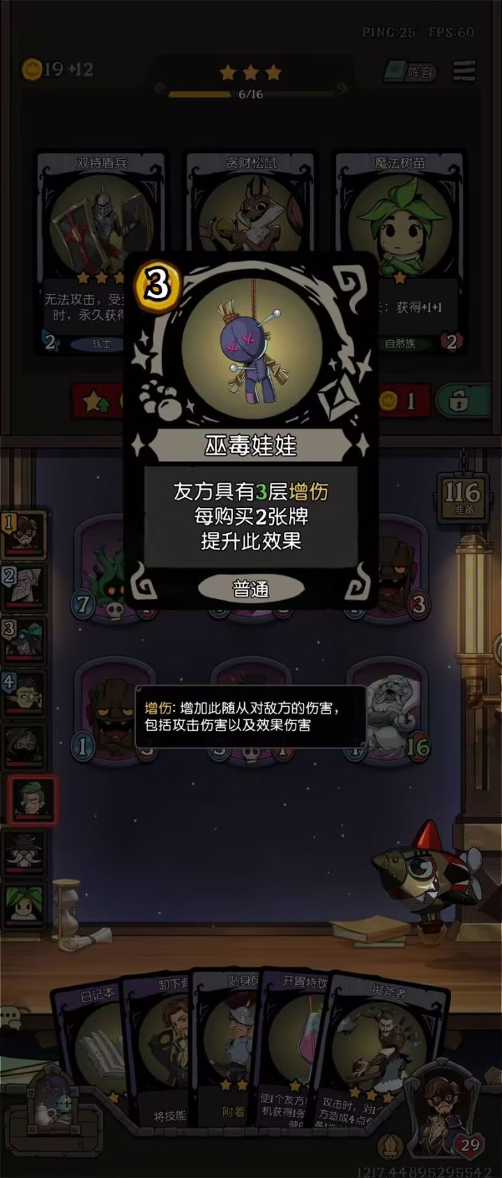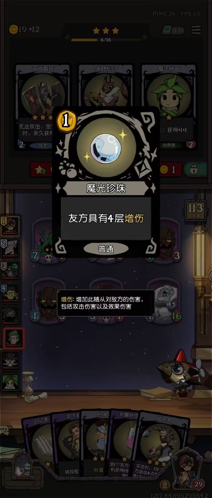 珍宝刷的好,真的是可以从头胡到脚啊,今天这一局,开始我选了一个假面,进去一看有版本之子,就期待5回合前可以偷到技能,结果真的偷到了,直接给我开启3珍宝局,因为阵容还没有想到,开始准备遗言龙,但是第一个珍宝就来了一个增伤的,我就准备来盾牌战士,这个和这个增伤的还是比较搭配的,结果后面连续出来了两个珍宝都是大胡啊,都是这个魔光珍珠,不过等级不一样,一下子就几十层的增伤出来了