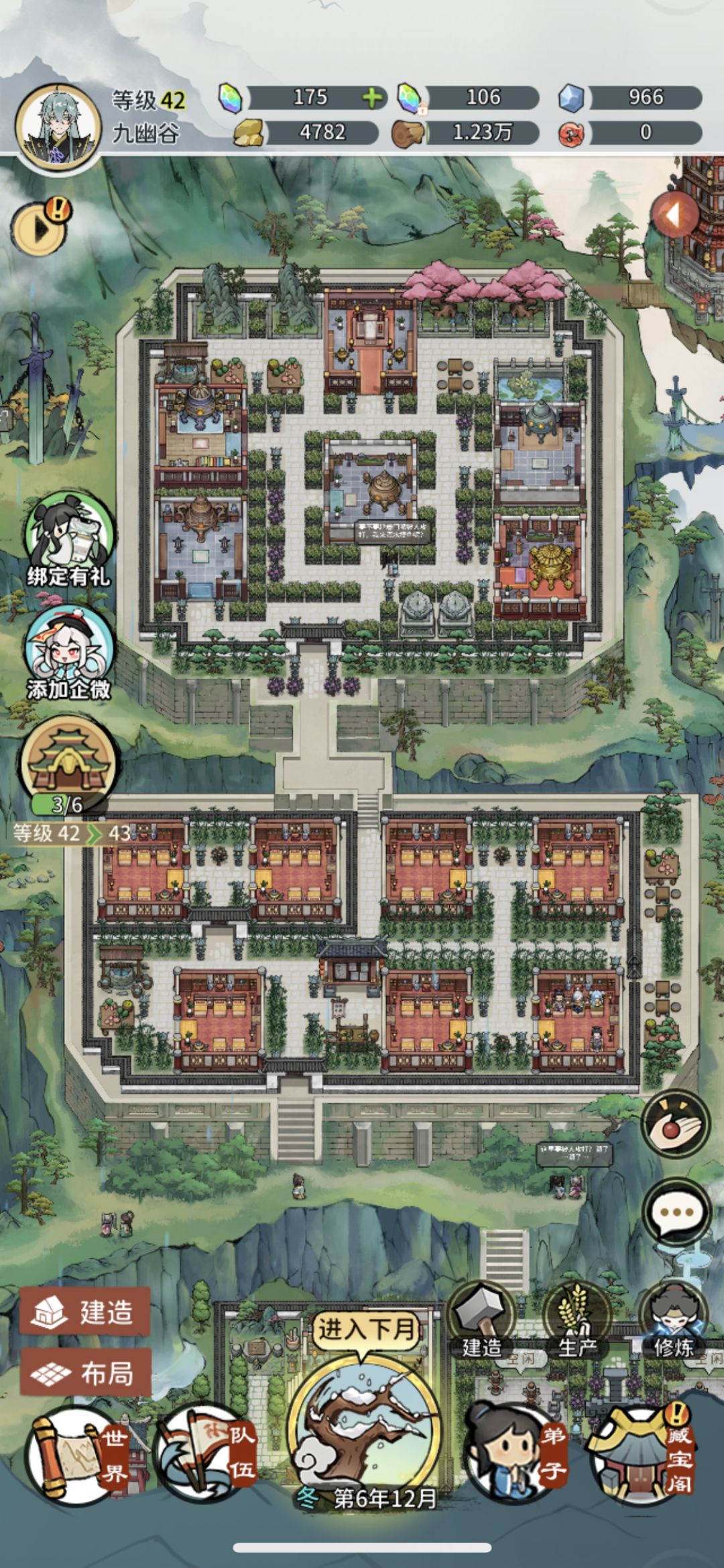 分享一下自己的门派布局图,总体来说还是以对称为主,兼顾各建筑功能与朝向,美中不足的是多建了一个厢房,有一点不协调,后面的场地开了应该就好了。算了下,最后一块场地,摆剩下的建筑,应该也够了。