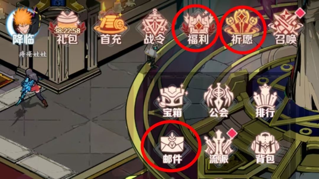 🔸开局进入游戏,通关新手森林秘境,完成初步引导后,会让我们进入长城秘境继续推图。注意了,我们进去不要打怪,转两圈,然后点击右上角设置-退出战场,退出来,这时会解锁邮件、福利、祈愿系统