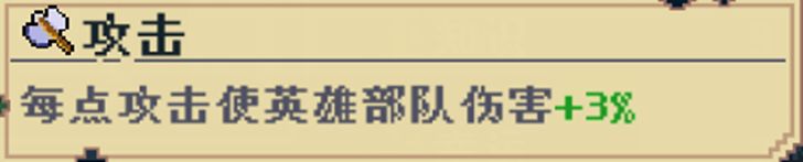 1. 攻击:每1点英雄攻击都会给英雄携带的士兵提升3%伤害,假设1个士兵伤害普攻伤害为10点时,其英雄的攻击为10时,则该士兵的伤害为提升30%,其每一次普攻造成的伤害即为13点