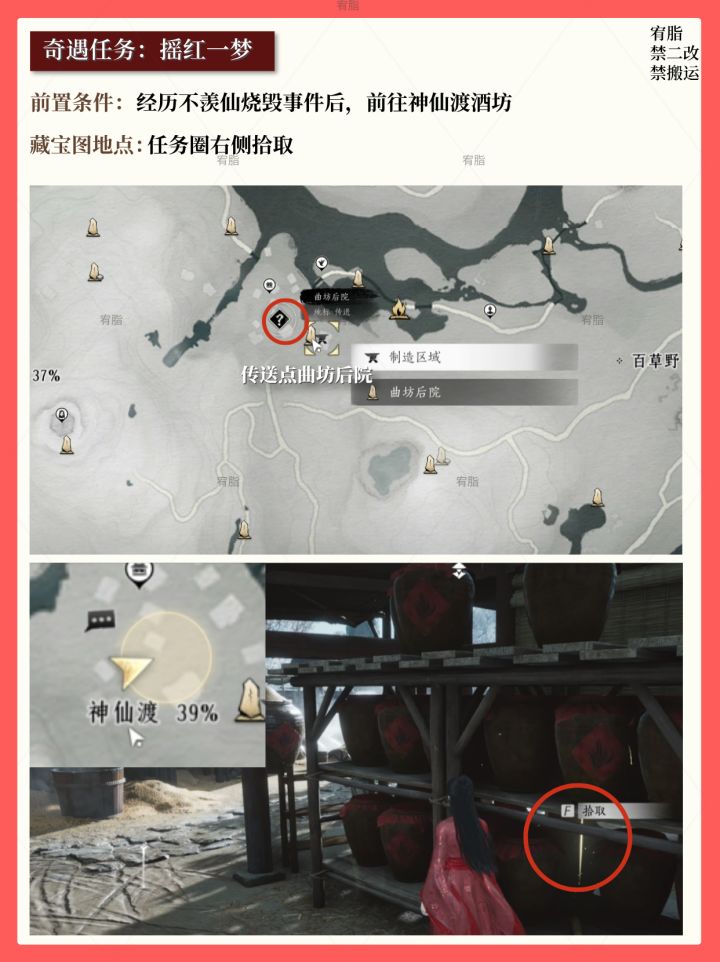 红线遗留之物一定要拿! 经历不羡仙烧毁事件后,前往神仙渡酒坊 一共五个藏宝图详细点位灾后方 #燕云十六声