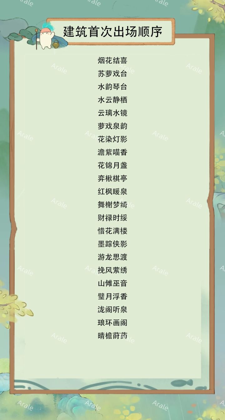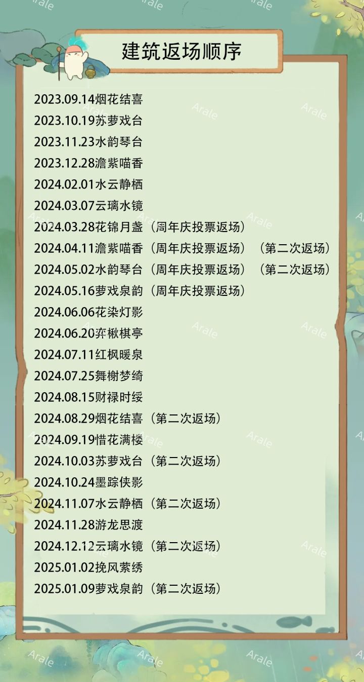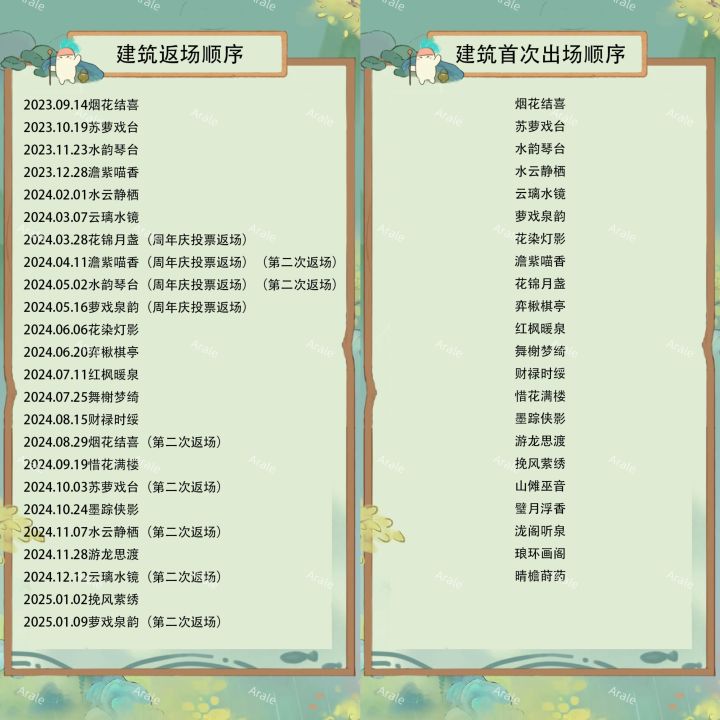 整理了一下桃源已经返场的建筑时间和顺序,和建筑首次出场顺序对比下来,除了周年庆投票返场,其余基本是按照建筑首次出场顺序来进行返场的。按这个顺序来的话下期返场的建筑就是山傩巫音+花染灯影。不过具体的还是按照官方发布的为准,只是推测。