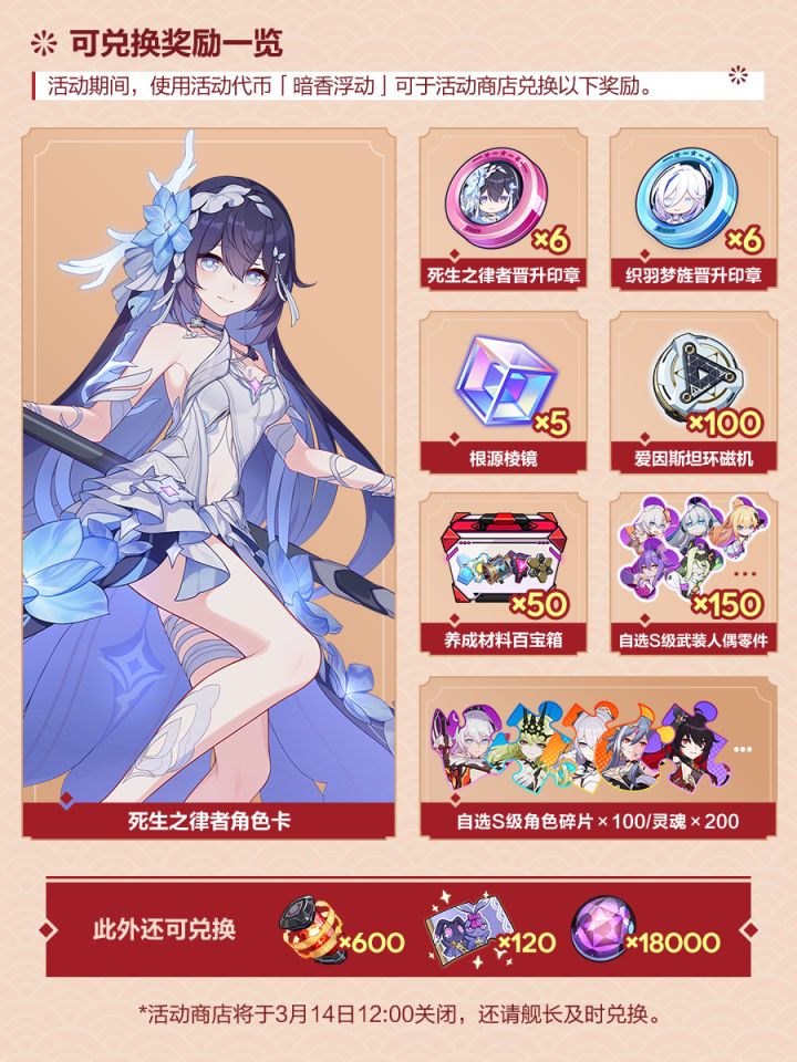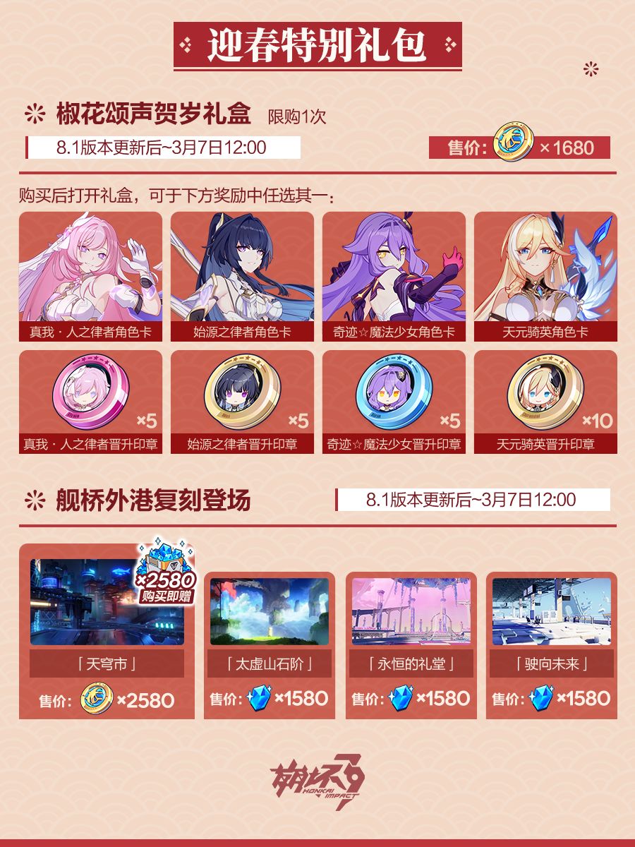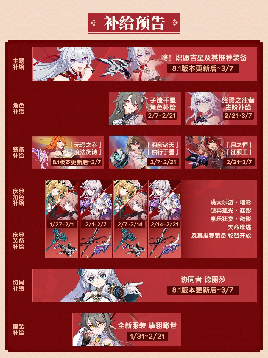 舰长好,在8.1版本中将开放迎春累消活动,活动期间舰长参与各类补给累计消耗3万水晶,即可领取月下誓约·予爱以心全新服装「红繁香满」。同时参与补给还可获取活动代币「暗香浮动」,使用代币可在活动商店兑换获取死生之律者角色卡/晋升印章、织羽梦旌晋升印章等丰富奖励!