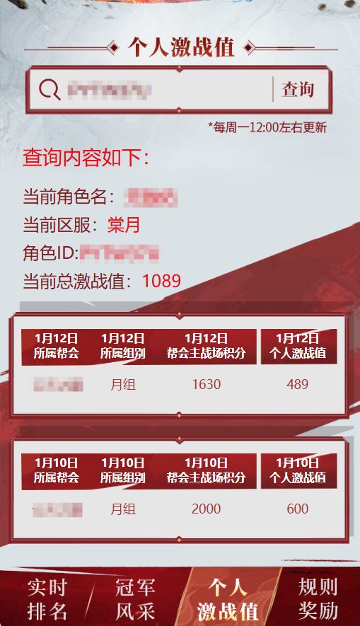 在搜索框内输入您的角色ID即可查询当前角色的激战值获取情况。激战值将在每周一中午进行更新,大家可以实时在专题中查询自己获得的激战值。