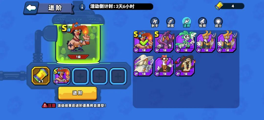 ● 拥有本职业的对应种类的神话(及以上)英雄后,英雄才可进阶;英雄种类分为3种:普通英雄,S英雄和S流派英雄