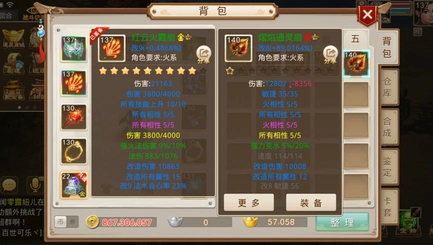 二哈大晴天:这位道友人物才137级,就已经准备好140级的敏火、法火、体火、力火装备。敏火装备可以用来与人团战,给队友拉上速度,先发制人;法火装备可以用于刷道和日常,嘎嘎好用;力火装备则是在队伍飞仙需要力的时候化身力火,提升刷道效率,更能在与人单挑时一展锋芒;体火装备则可以用来刷塔通关,也可以用来挑战高端首领,还可以在与人对战时后手控,实现翻盘。