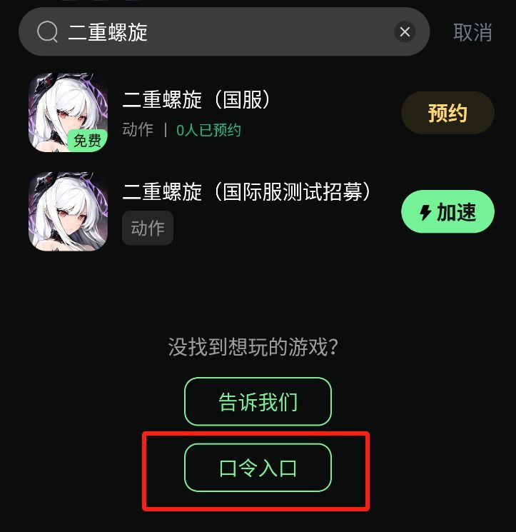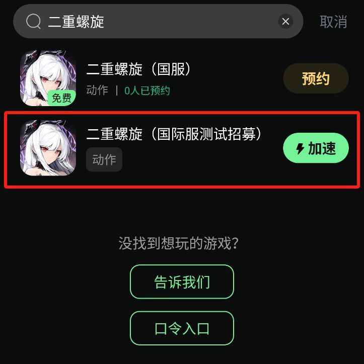 第三步:奇游内搜索【二重螺旋】,点击加速即可跳转至国际服官网进行预约