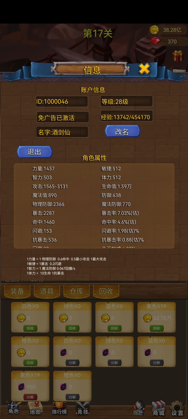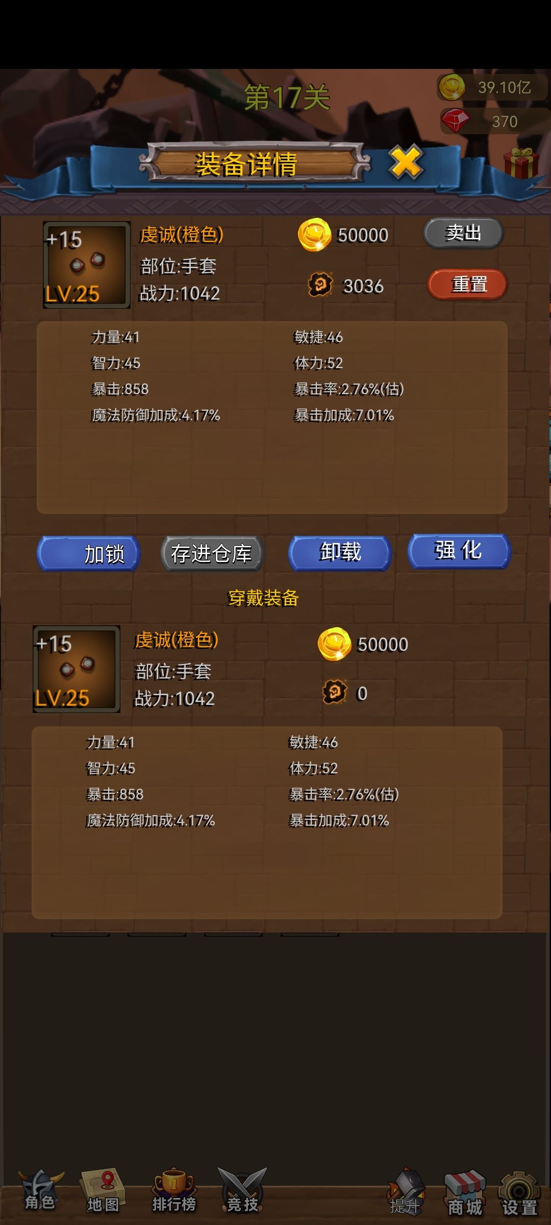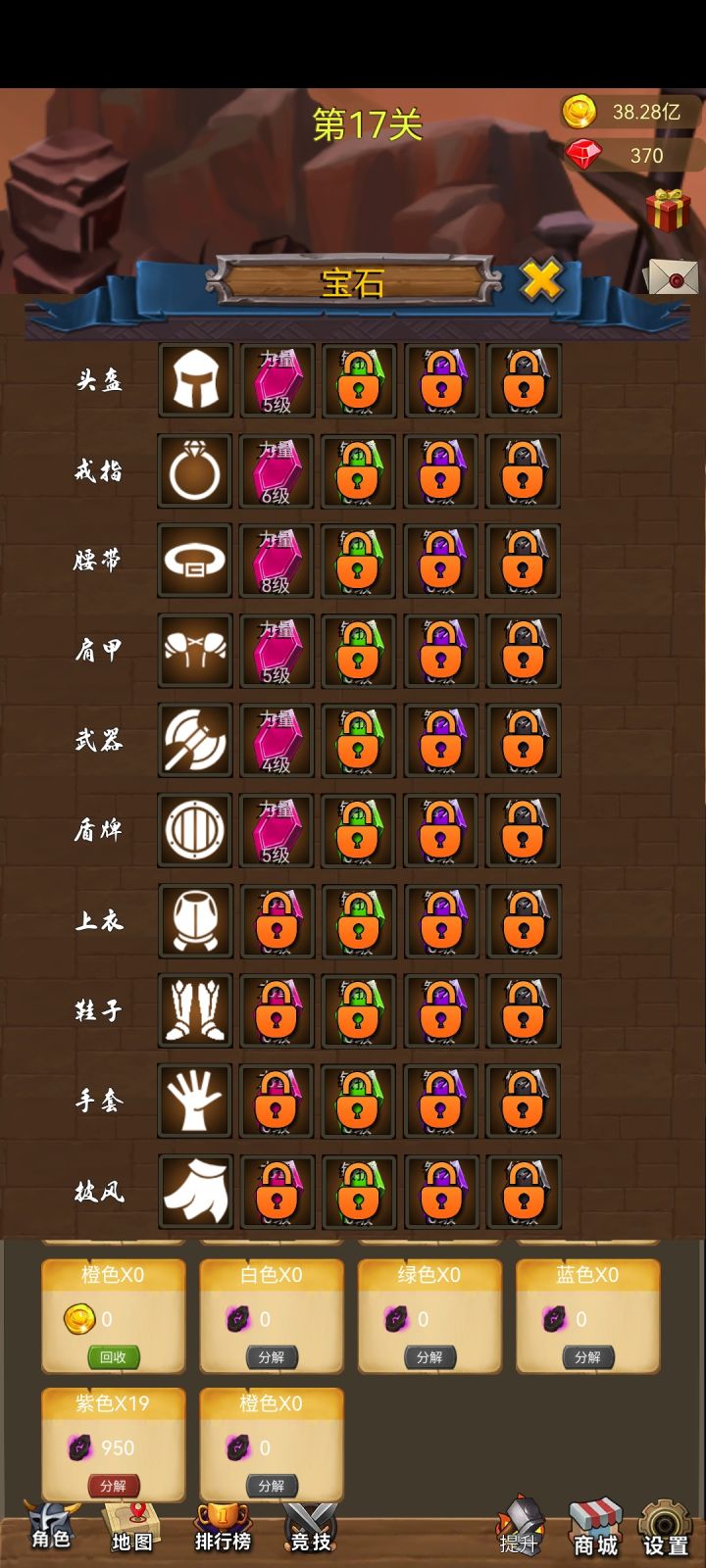 游戏比较简单,目前就两个战力组成板块,一个装备,一个宝石,宝石前期提升较大,但是升级要求资源比较多,零氪玩家可以先放着,没有也不影响游戏进程。装备的话每五级一换,装备属性全随机,最好的词条为力量,其次是攻击加成。
