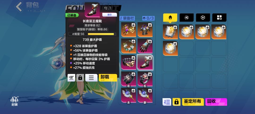 装备里面,基本没有大的变化,主要是把鞋子换成了一个自制鞋,加了一点护盾,提高生存