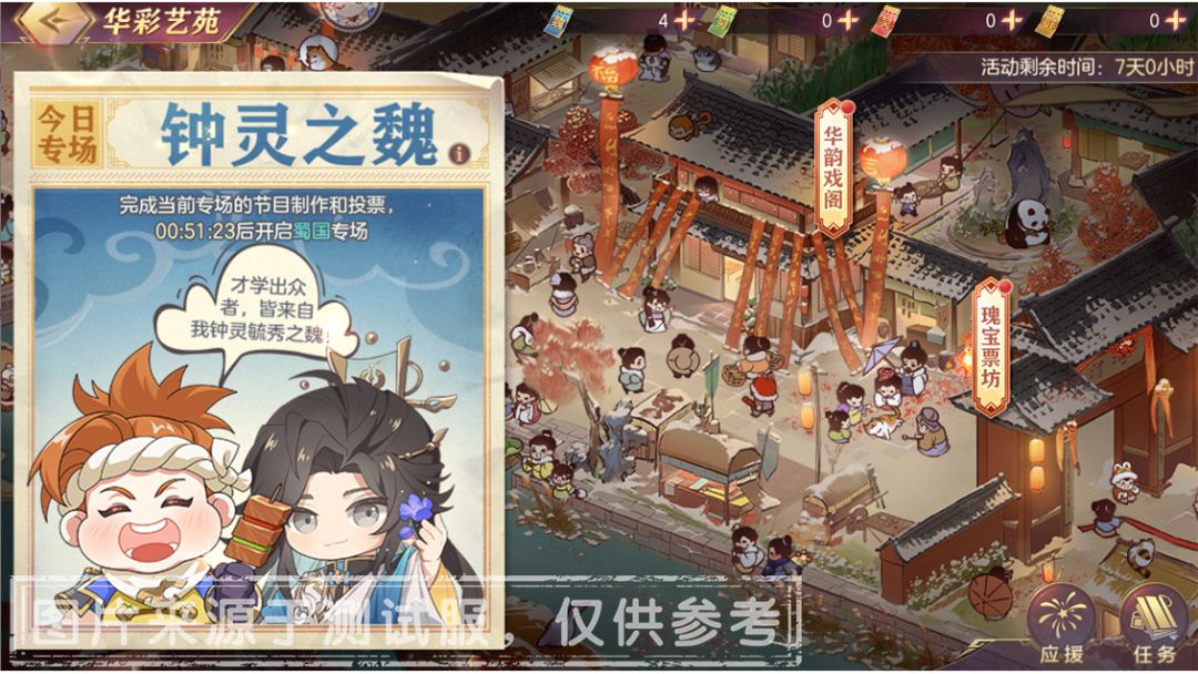 2、本次活动主办方将为每个专场的票选冠军节目定制表情包(总计4个)。完成全部【瑰宝票坊】投票任务可获得「橙色专属幻武碎片」*30、「2星幻武升星材料」*3、「极品陨铁」*3、「华彩艺苑节目表情包」*1等丰厚奖励。表情包将在活动结束后制作更新,届时小将军可通过使用该道具获得。