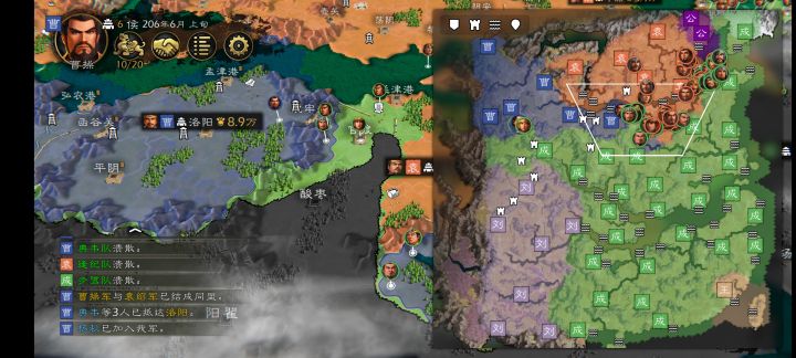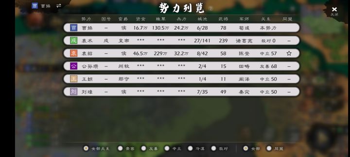 昨天看评论兄弟们的建议放弃陈留,吞并马腾,成功盘活,出现的唯一意外就是马腾就剩最后一个城的时候投降袁术了!直接导致和袁术开始交战