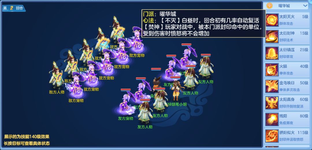 首先说一下,在幻唐志手游里是存在昼夜效果的,在白天没有影响,在晚上则会降低全体单位的攻防,只有带了【夜战】和【高级勇敢】的单位可以规避,而曜华城是一个可以使日夜颠倒的封印门派,不仅可以封印对手,还可以利用夜晚的减攻减防效果,通过让敌方进入夜晚,从而为队友创造一个良好的输出环境。