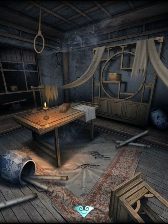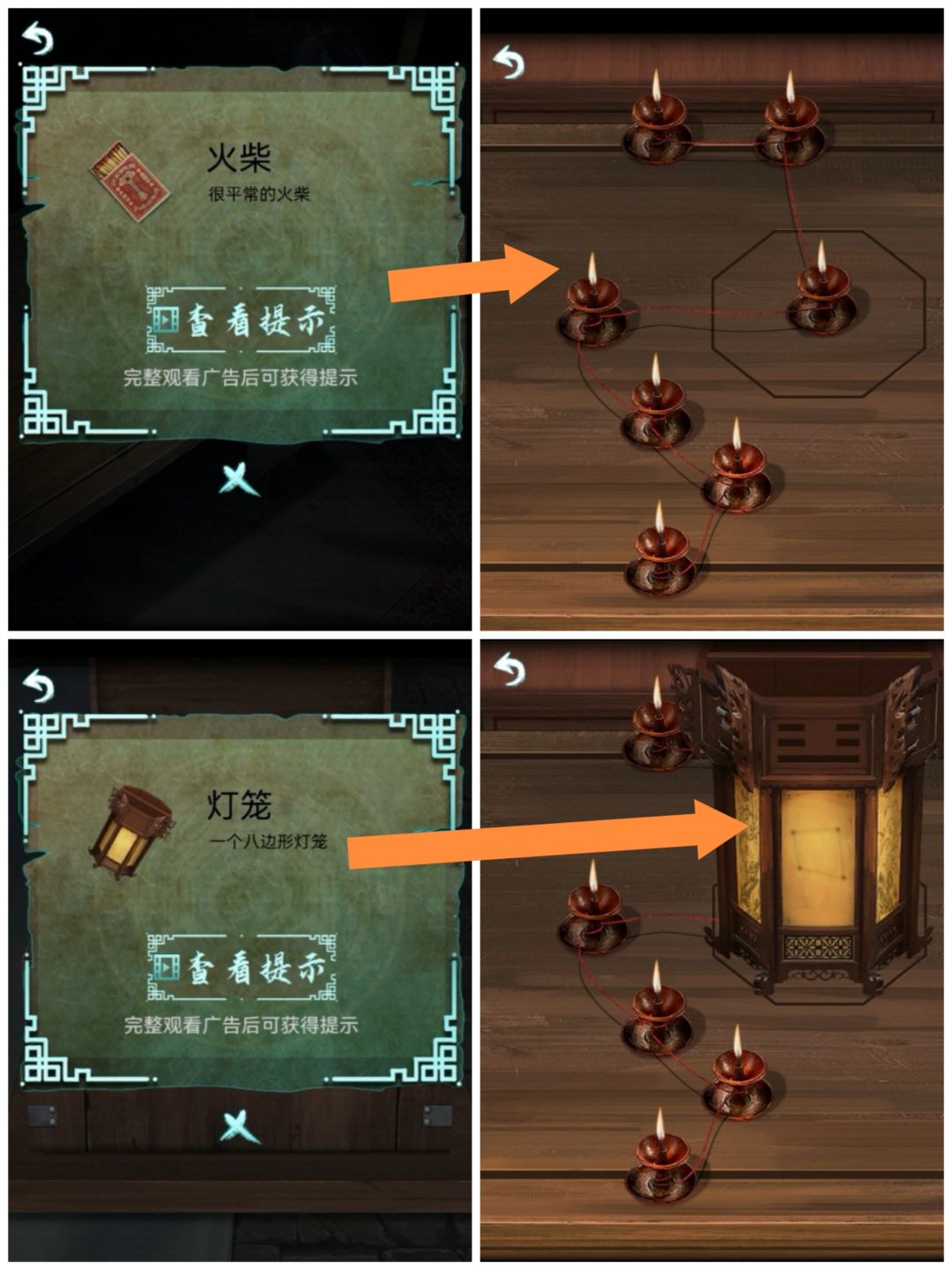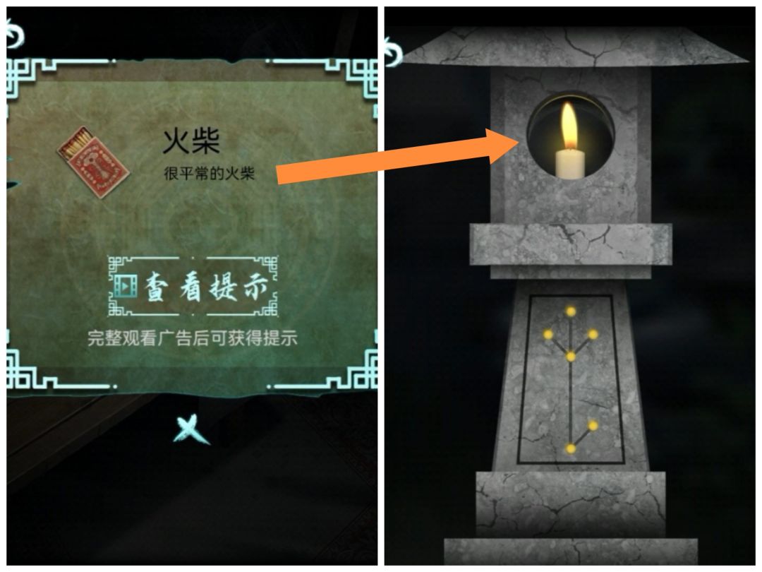 火柴点燃台灯,把灯笼放在桌子印上,得到线索