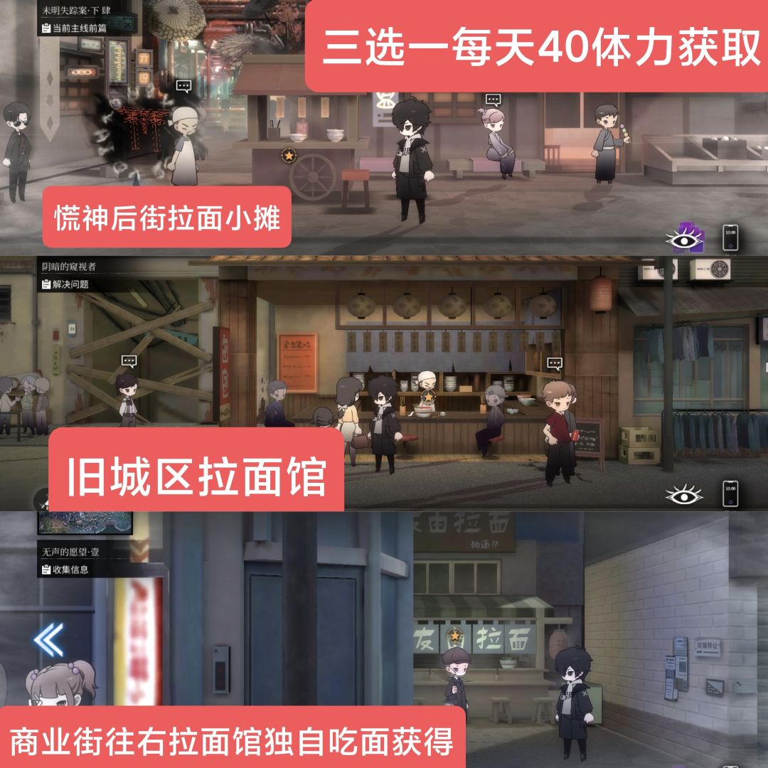 体力除了每日10点和17点福利赠送,还可以在以下三个地方随机三选二吃面每次+20体力!