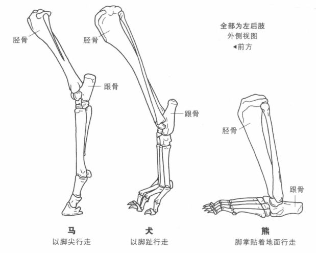 上图从左到右为马、犬、熊的后足/肢骨骼图,它们分别对应行走模式: