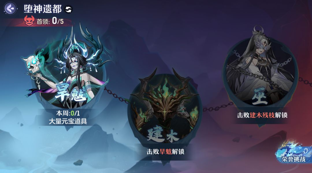 <堕神遗都>采用类似闯关爬塔的游戏机制,每一个关卡由共工旗下的妖王所镇守,如旱魃、建木、巫、梼杌等,每位妖王将会随着赛季进度、通关进度,解锁不同的难度供御灵师们挑战。