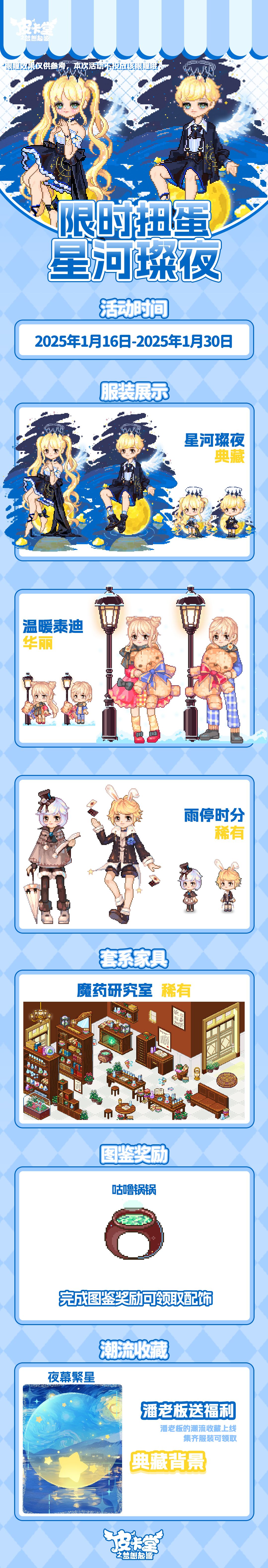 -【限时金币扭蛋】更新!参与可获得典藏套装「星河璨夜」、华丽套装「温暖泰迪」、稀有套装「雨停时分」,套系家具「魔药研究室」!收集服装可获得名片背景「夜幕繁星」!完成图鉴收集任务可获得配饰「咕噜锅锅」!