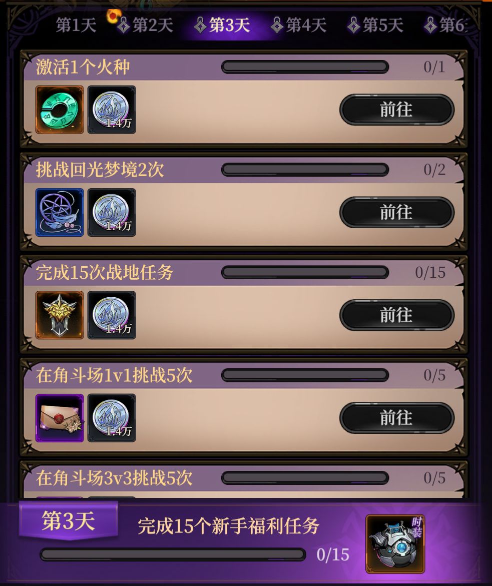 第三天福利任务:共有18个任务,在活动时间范围内完成15个新手福利任务即可获得限时时装,且每个任务均有福利奖励