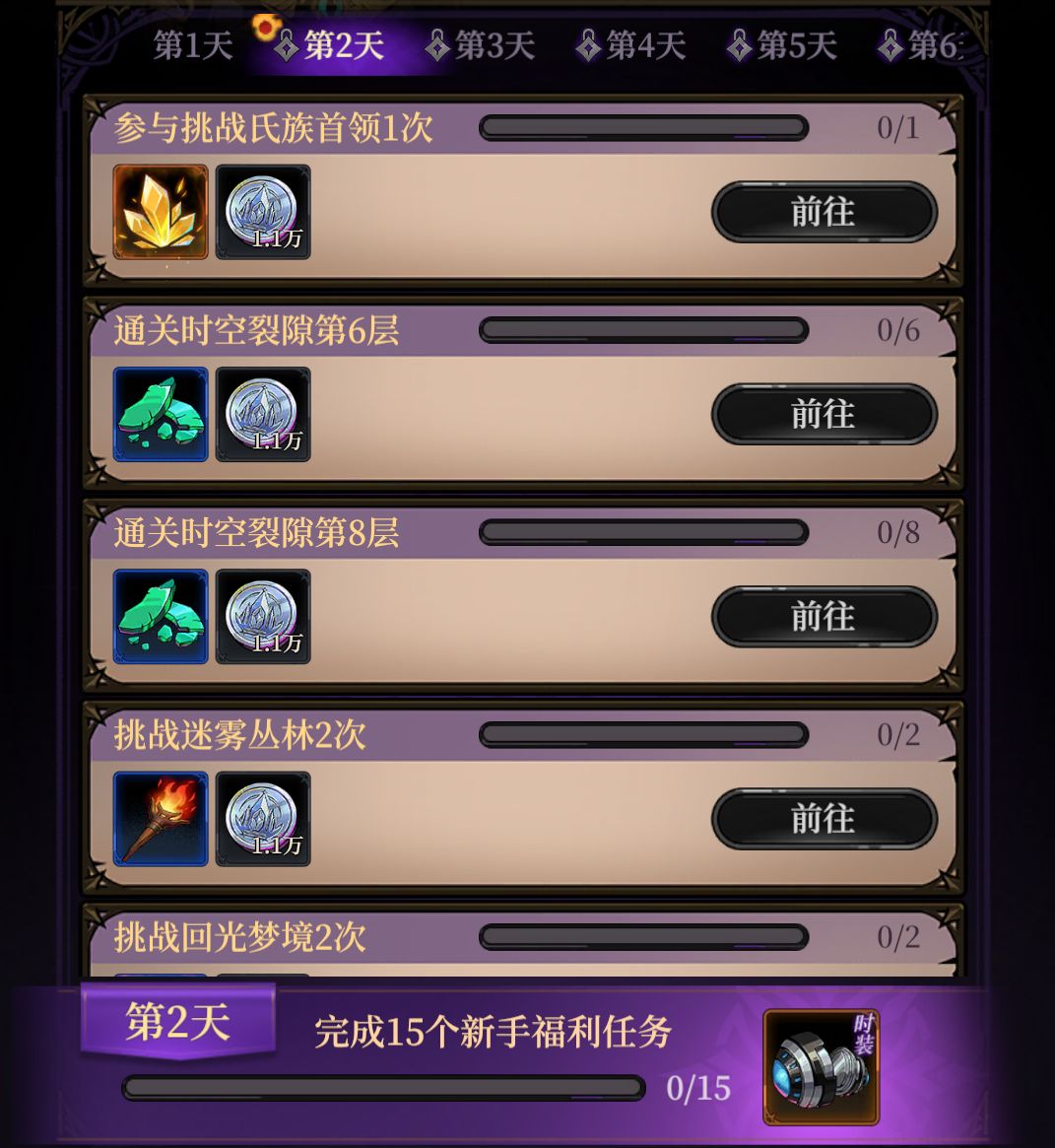 第二天福利任务:共有19个任务,在活动时间范围内完成15个新手福利任务即可获得限时时装,且每个任务均有福利奖励