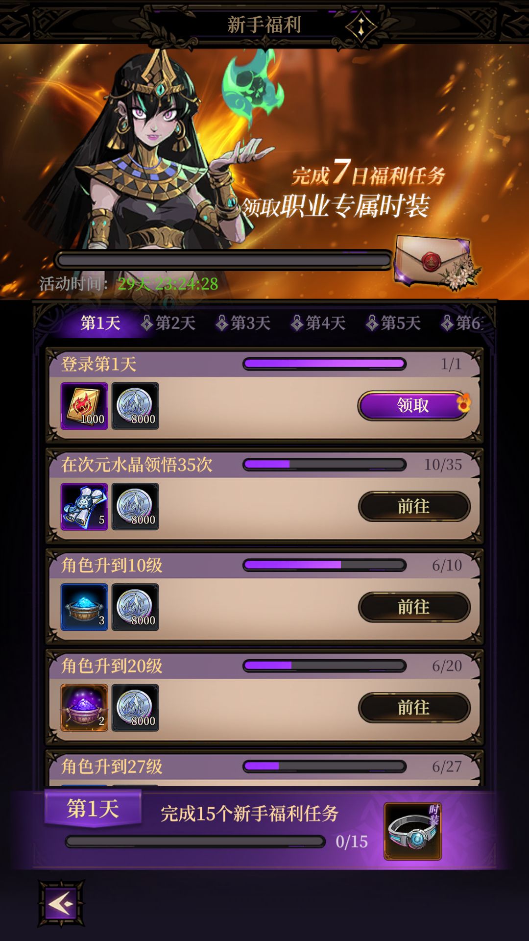 第五天福利任务:共有19个任务,在活动时间范围内完成15个新手福利任务即可获得限时时装,且每个任务均有福利奖励