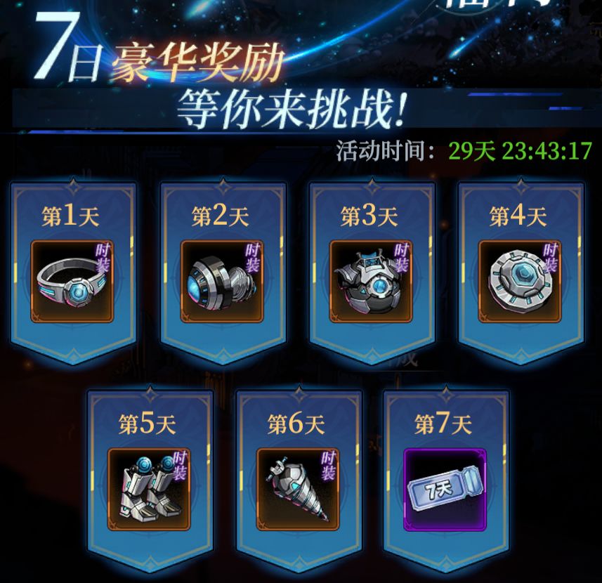 第七天福利任务:共有19个任务,在活动时间范围内完成15个新手福利任务即可获得7天白银卡,且每个任务均有福利奖励