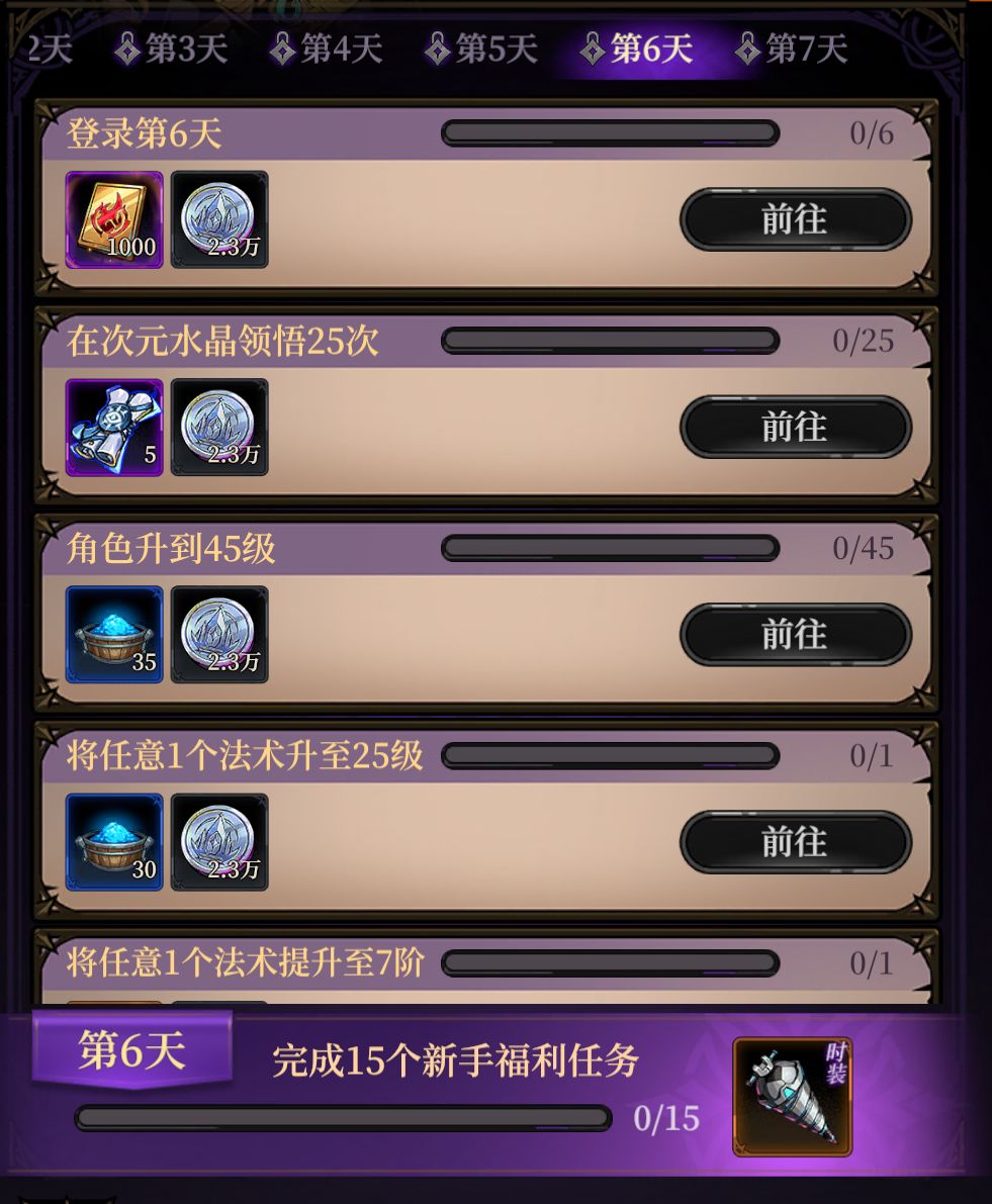 第六天福利任务:共有19个任务,在活动时间范围内完成15个新手福利任务即可获得限时时装,且每个任务均有福利奖励